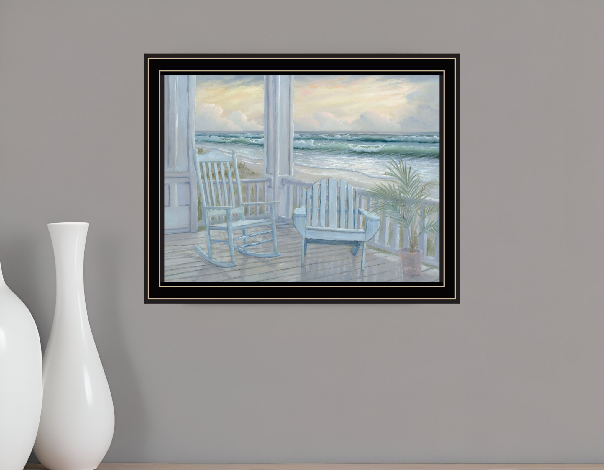 The coastal porch black framed print wall art is the perfect decorative accessory for your home. This print is a visual artistic expression that allows you to decorate your space in style. Reproduced for you on wood, this hanging decorative accent will be a trendy and fashionable way to dress your walls in a rustic and modern farmhouse vibe. Hang on your wall to add some up to date fashion and decoration. Utilize this opportunity to create a focal point in the room with this fabulous wall decor option. 14-inch H x 18-inch W x 1-inch D