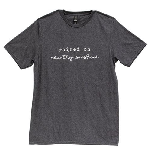 The Country Sunshine T-Shirt is a gray cotton-blend tee with a unisex fit. The shirt reads “raised on country sunshine” in decorative white lettering and has a relaxed, comfortable fit. Available in five sizes, S-XXL (see GL110XL for size XL). Size XXL.