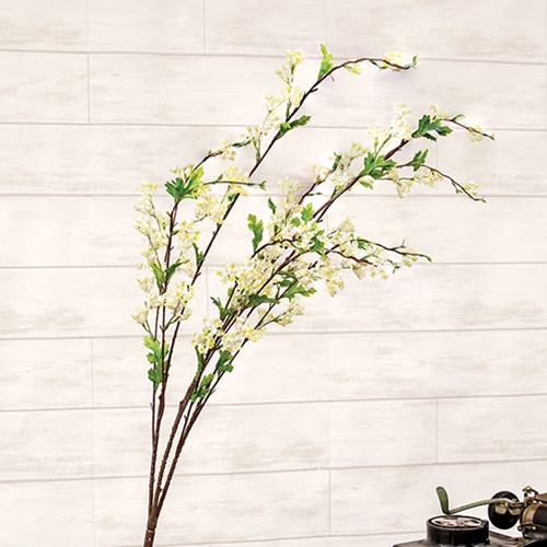 The Cream Lilac Branch completes decorative displays with a fresh splash of nature-inspired style. A brown plastic stem sprouts brown branches complete with textured green leaves and detailed white lilac florals. The flowers feature a layered design that uses fabric and plastic elements to create a realistic look. Measures 35” high by 6” in diameter.