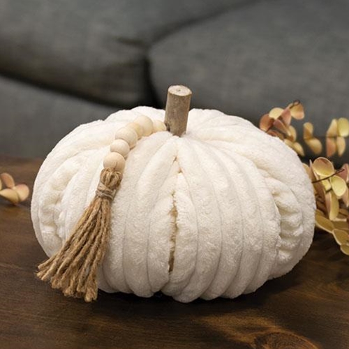 The Large Cream Ribbed Pumpkin is a decorative plush pumpkin figurine made of ultrasoft cream-colored fabric with a raised ribbing pattern. The pumpkin has a wooden stem and features a jute tassel charm, strung with round wooden beads. This pumpkin has a weighted bottom and brings a cozy, modern touch to the home during Fall, placed on a table, shelf, chair, or bed. Measures 6” high and 8.5” in diameter.