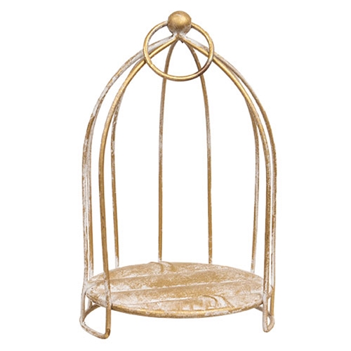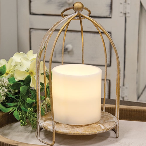The Distressed Golden Birdcage Lantern makes a unique and elegant addition to springtime or everyday decor. The lantern features a rounded birdcage-inspired shape for a whimsical effect. Made from metal, the lantern features a metallic gold finish with white distressing. An open back allows for easy placement of an LED candle or other decorative accent. Measures 8.5” high by 5” in diameter.