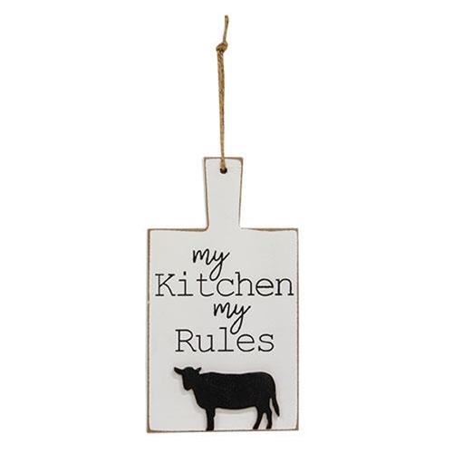 Distressed My Kitchen My Rules Cutting Board Ornament is a wooden cut-out ornament with a cutting board design. Ornament has a jute hanger for easy display and it reads, “my kitchen my rules” in black text with a black cow cut-out. Ornament looks great in a kitchen or dining room and it measures 7″ high by 4″ wide by .5″ deep
