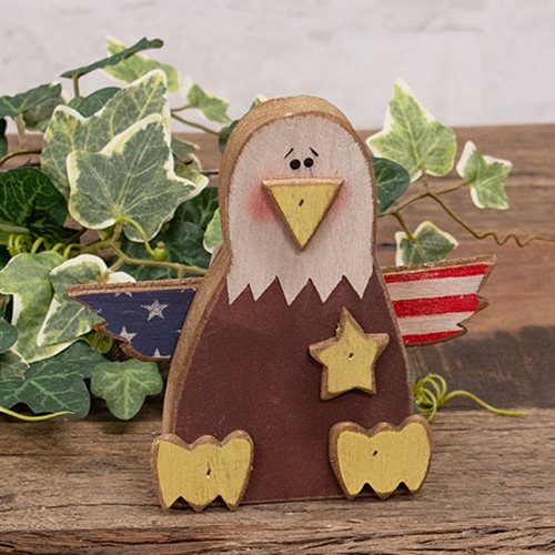 The Distressed Wooden USA Eagle Sitter brings a friendly accent to patriotic shelf or tabletop decor. Made from wood, the sitter features chunky layered cutout design. The eagle is painted brown and cream, with detailed facial features, flushed cheeks, and a yellow beak and talons. A cutout yellow star adorns the eagle’s chest and his wings are shown outstretched. One wing is painted navy blue with white stars and one is painted with red and white stripes, reminiscent of an American flag. A flat bottom edge allows the sitter to stand freely. Measures 5.75″ high by 6″ wide by 1″ deep.