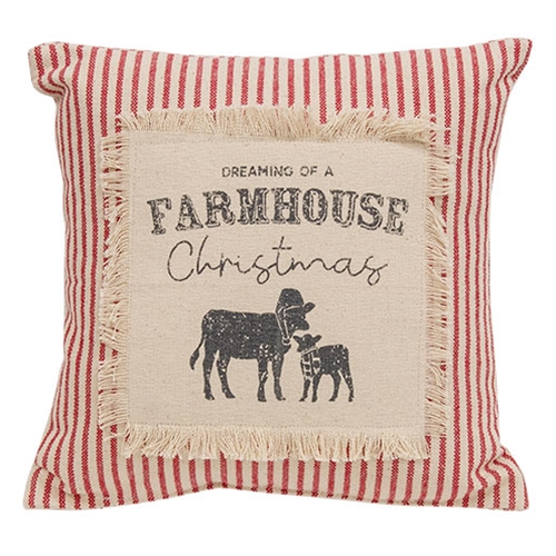 Dreaming of a Farmhouse Christmas Red Ticking Stripe Pillow is a decorative throw pillow with festive farmhouse design. The pillow features cream and red striped canvas material. One side of the pillow is adorned with a fringed patch that features the silhouette of a cow and calf and reads, “dreaming of a farmhouse Christmas.” Pillow measures 10″ high by 10″ wide by 3.5″ deep.