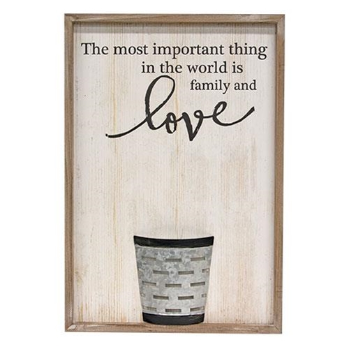 Family and Love Flower Pocket Sign is a framed wood sign with a metal pocket. Sign hangs by a pre-installed sawtooth hanger and it reads, “the most important thing in the world is family and love” in black text. It has a distressed white print and it measures 19.5″ high by 14″ wide by .75″ deep.