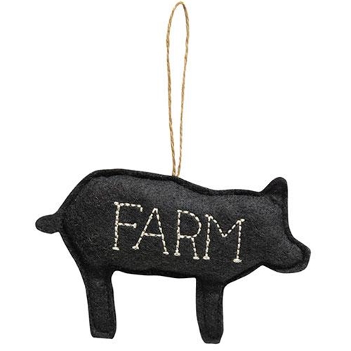 Felt Farm Pig Ornament is a black pig plush ornament that reads, “FARM” in stitched white lettering. Pig is made of felt fabric that has been lightly stuffed and it has a jute string for hanging. Measures 3.25″ high by 5″ wide by .5″ deep.