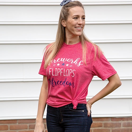 2XL, Heather Red, Fireworks Flipflops Freedom T-Shirt is a super-soft cotton-blend tee with a unisex cut. Tee has a festive red color and it reads, “fireworks flipflops & freedom” in white and blue text with star accents. It is perfect for Fourth of July celebrations and it is available in five unisex sizes: S-XXL (see GL100 for sizes S-XL). Proudly designed and printed in Ohio! Size XXL.
