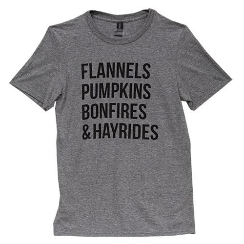 Flannels T-Shirt, Heather Graphite, Medium, is a gray, cotton-blend t-shirt that features the phrase, “flannels, pumpkins, bonfires, & hayrides.” Show off a love of all things autumn in this soft graphic tee! Size medium.