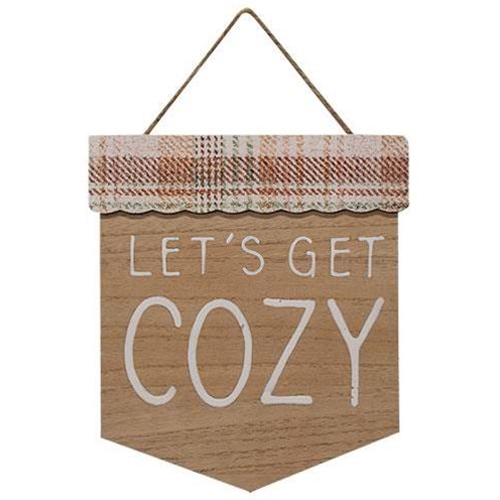 The Get Cozy Plaid Sign is a decorative wall hanging in the shape of a wooden pennant. The sign reads “Let’s Get Cozy” in white painted lettering and features a cozy plaid border at the top in a cream and brown color theme. The top of the sign includes a jute rope to use for display on a wall or door to add a warm and simple autumnal touch to the home. Measures 9” high by 8” wide by .25” deep.