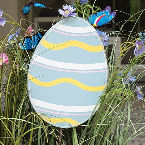 The Glittered Blue Easter Egg Planter Stake Topper brings a colorful accent to springtime decor. An egg-shaped wood cutout forms the base of this planter stake topper. The egg is painted blue with decorative yellow, white, and pink stripes. A thin line of white paint with an iridescent glitter finish outlines the egg. Added to a dowel or propped up with other decor, this versatile piece makes a unique addition to a mantel, tabletop, yard, or planter display. Measures 8” high by 5.75” wide by .5” deep.