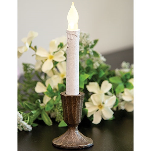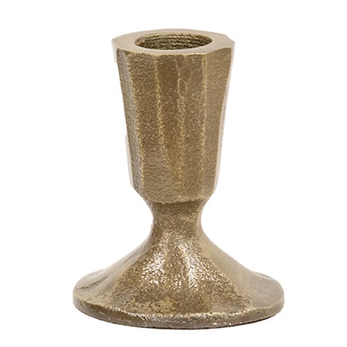 The Gold Painted Cast Iron Taper Holder is a unique and elegant candle holder crafted from cast iron. The taper holder is painted metallic gold and features a rustic textured finish. A flat base allows for stable display on a shelf, tabletop, or windowsill. Measures 3” high by 2.5” wide by 2” deep.