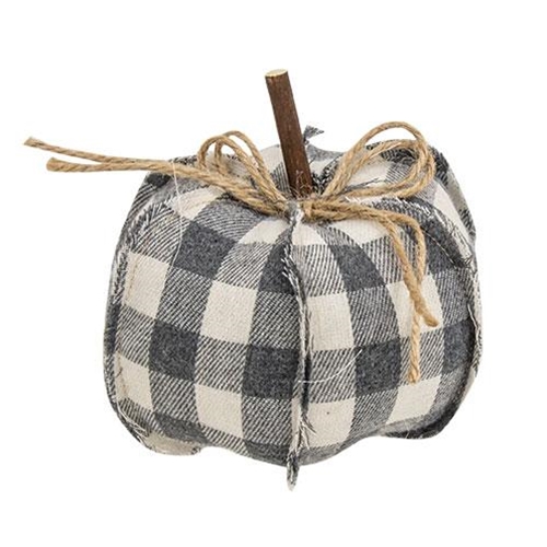 4.75″ Gray Check Stuffed Pumpkin is a stuffed fabric pumpkin with a gray and white buffalo check finish. Pumpkin is accented by a stick stem, a jute bow accent, and it has frayed ribbing for a primitive feel. Pumpkin is freestanding and looks great on a counter, tabletop, or tucked into a basket and measures 4″ high by 4.75″ in diameter.