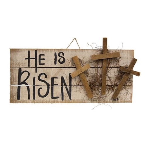 He Is Risen Hanging Pallet Sign with Crosses is a wooden slat sign with a painted and distressed tan finish. Sign reads, “He is Risen” in black text and it is accented by three wooden crosses and dried vine. It comes ready to hang by a jute rope installed at the back and it looks great on a covered porch, in an entryway, or hung above a mantel. Measures 13″ high by 24″ wide by 2″ deep.