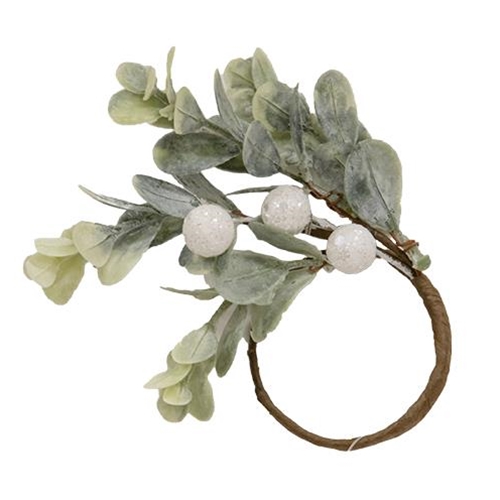 The Holiday Ombre Boxwood Ring is a decorative wintertime floral napkin ring with a twig-like, brown-wrapped base. The ring features branches of dusty green boxwood leaves, as well as a cluster of sparkling white mistletoe berries. Use this ring to secure a cloth napkin, adding a neutral and festive accent to any Winter or Christmas tablescape. Measures 2” in diameter.