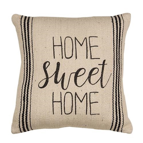Home Sweet Home Pillow is a decorative accent pillow that features the phrase, “Home Sweet Home,” on a neutral, cream colored fabric. Design is accented with black striping details on each side. Pillow measures 10″ square.