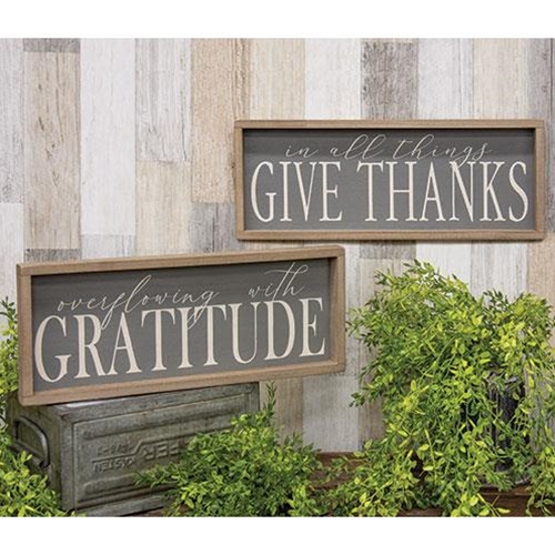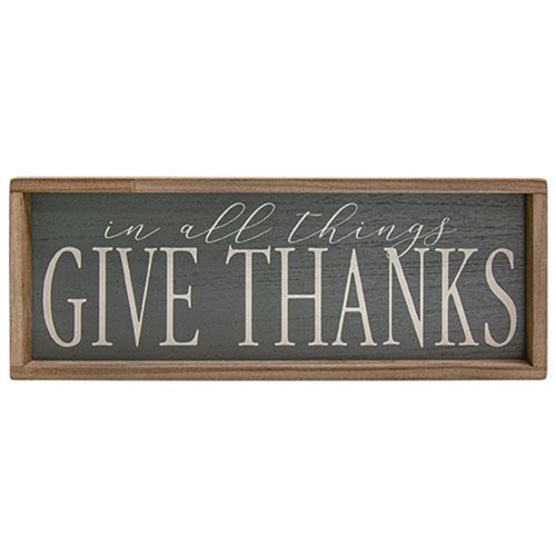 In All Things Give Thanks Weathered Framed Sign is a wooden sign with an unpainted frame and gray background. Sign features the phrase, “in all things give thanks,” in cream-colored lettering and includes two sawtooth hangers on the back for wall display. Sign is perfect for an entryway or hung above a mantel and measures 6.75″ high by 18″ wide by 1″ deep.