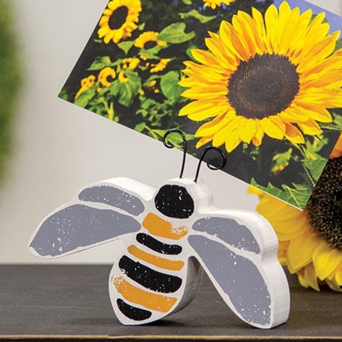 Large Chunky Bee Photo Holder is a freestanding photo holder with a bee shape and design. Bee has metal feelers and a painted and distressed finish that complements primitive decor. It looks great displaying photos or on its own and measures 4″ high by 5.5″ wide by 1″ deep.