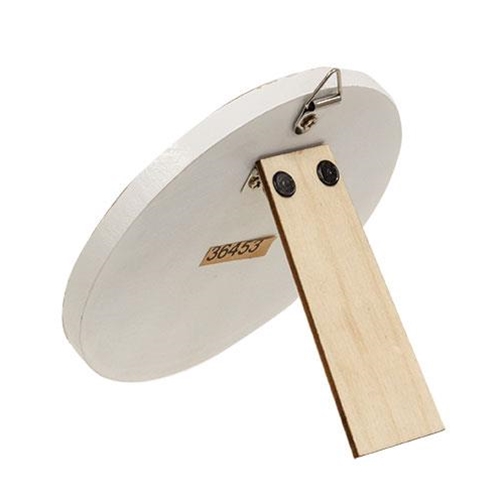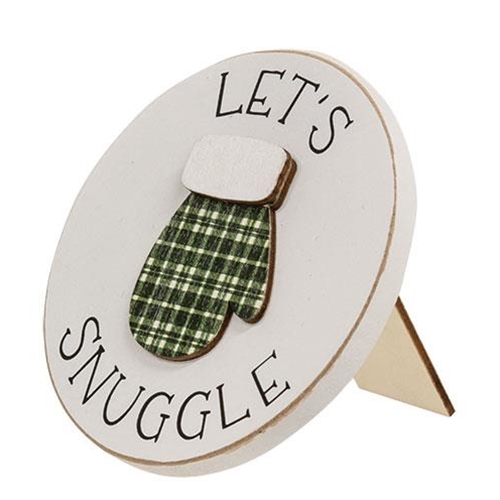The Let’s Snuggle Easel Sign is a decorative round wooden sign with a distressed white finish. The sign reads “Let’s Snuggle” in rustic black lettering and features a wooden mitten cutout with a green and white plaid pattern. Display this sign on a wall using the installed hanger on the back, or lean atop a shelf or tabletop using the easel kickstand for a sweet and cozy addition to Winter and Christmas home décor. Measures 4” in diameter and .25” deep.