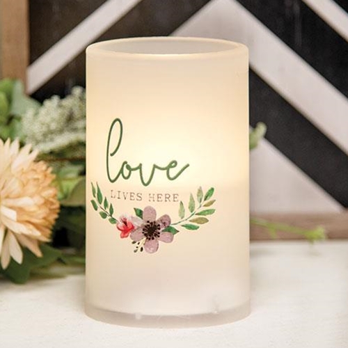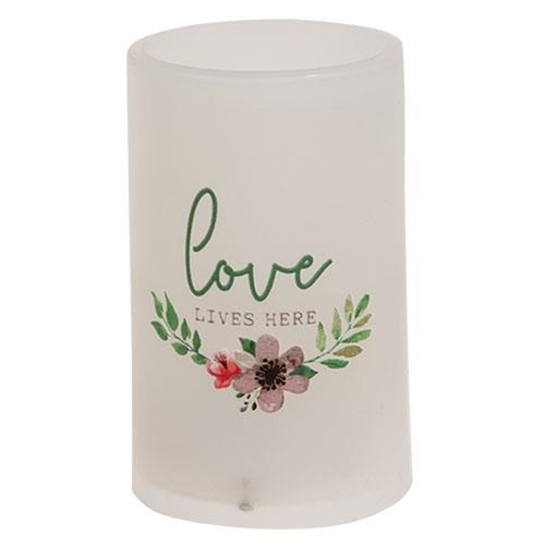 3″x5″ Love Lives Here Timer Pillar is a frosted plastic candle with a built-in timer that remains lit for 6 hours and then shuts off for 18 hours at the same time each day. It reads, “love lives here” in green and brown text and it is accented by a pink and red floral design. Pillar requires three AAA batteries to operate (not included) and it casts a soft yellow light when switched on. Measures 5″ high by 3″ wide by 3″ deep.