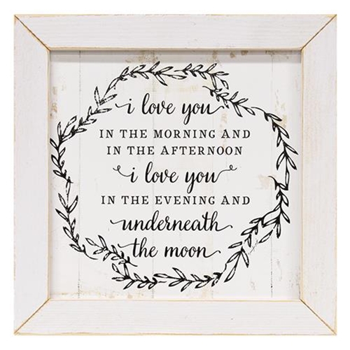 Love You in the Morning Framed Print is a black and white sign that features the romantic quote, “i love you in the morning and in the afternoon – i love you in the evening and underneath the moon.” Quote is surrounded by a graphic vine wreath design on a distressed, white painted background. Print includes a distressed wooden frame with a keyhole hanger on the back. Measures 13.5″ square by .5″ deep (including frame). Designed by artist Jennifer Pugh and made in the USA!