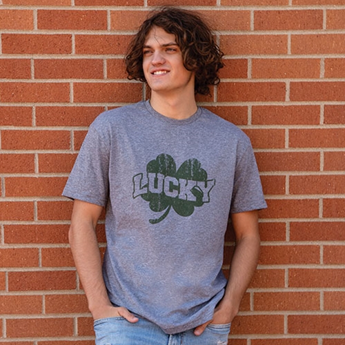 The Lucky T-Shirt is a soft, festive tee made of cotton-blend fabric in a dark heather-gray color. The shirt has traditional block lettering reading “Lucky”, ribboned across a distressed green shamrock graphic, making it a fashionable addition to any wardrobe during the St. Patrick’s Day season. The tee is available in five unisex sizes, S-XXL. Size Medium.