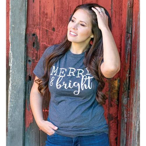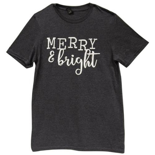 Small Merry & Bright T-Shirt (White Ink) is a festive heather gray tee that looks great with jeans or pajamas. Tee is a super soft, pre-shrunk cotton-poly blend and reads, “Merry & Bright” in white text. It is printed and designed in Ohio and measures 25.5″ high by 17.25″ wide. Size small; unisex.