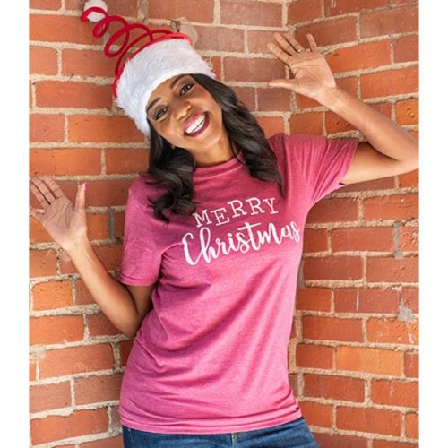 Small Merry Christmas T-Shirt is a festive heather red tee that reads, “Merry Christmas” in white lettering. Tee is made with a pre-shrunk and super soft cotton-poly blend and it is proudly printed and designed in Ohio. It looks great dressed up or down and makes a great pre-Christmas gift. Measures 28” high by 18″ wide. Size small.