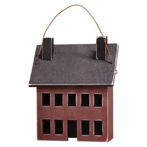 Mini Burgundy Saltbox House Ornament is a wooden ornament with a house shape and design. Ornament has a metal wire for hanging display and it features a distressed black roof and a distressed burgundy exterior. It is accented by two chimneys and a cut-out door and windows and it measures 4.5″ high by 4″ wide by 1.5″ deep.