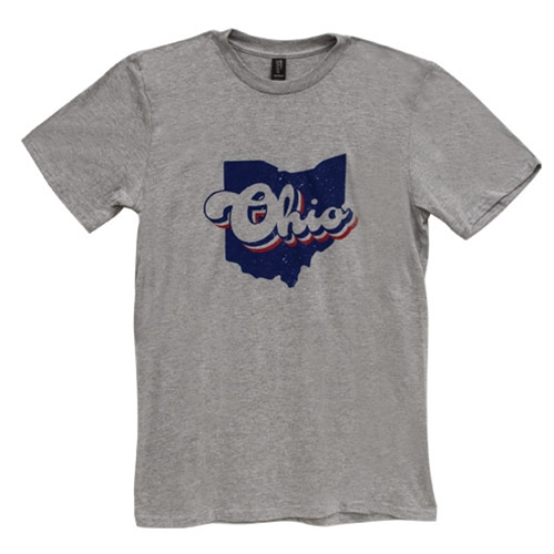 The Ohio Red/White/Blue T-Shirt is a soft everyday tee made of cotton-blend fabric in a neutral, marled gray color. The shirt reads “Ohio” in a retro script font, overlaying a dark blue state of Ohio graphic, complete with red detailing. This shirt is a fashionable addition to any wardrobe year-round, perfect for showing off state pride. Available in five unisex sizes, S-XXL. Size Large.