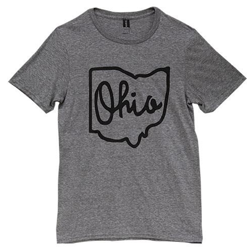 Ohio T-Shirt, Heather Graphite, Small, is a gray, cotton-blend t-shirt that reads, “Ohio,” surrounded by an outline of the state. Super soft and stylish this piece is the perfect way to show off some hometown pride. Size small.