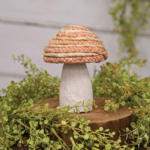 The Green Braided Mushroom is a bold, bright accent for decorative spring or everyday displays. A short white stem with a textured finish features a flat base for versatile standing display. The mushroom’s cap is crafted from braided jute with a pink and natural beige swirl design. Measures 5.5” high by 4” in diameter.