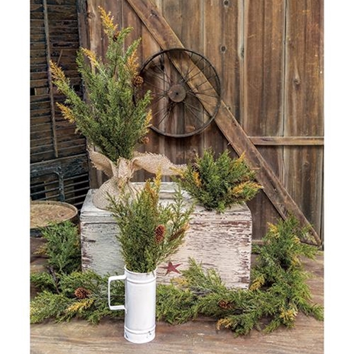 The 18″ Moss Green Prickly Pine Tree branches are filled with short needled pine in shades of light to medium green with some tips in a golden brown color for a natural appearance. The tree has a weighted base covered with burlap for country farmhouse style. Several pinecones are scattered throughout the branches. Measures 18” high.