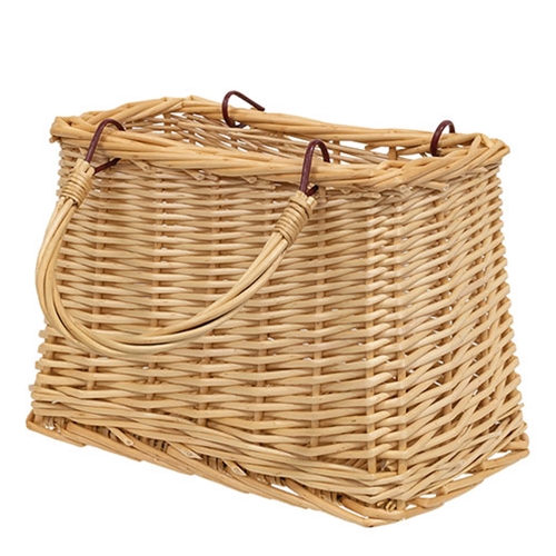 The Willow Tapered Basket is a decorative and functional basket container made of woven willow reed material with a natural tan finish. The basket is rectangular with a tapered design, narrow at the top, and features two rounded handles. Display this basket sitting on a shelf or table, filled with florals, greenery, books, or other decorative items for a charming and rustic accent for the home. Measures 7” high by 9” wide by 5” deep.