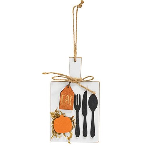 The Silverware and Pumpkin Cutting Board Ornament is a decorative wooden cutout ornament in the shape of a handled cutting board with a white painted finish. The ornament is decorated with black silverware silhouettes, an orange pumpkin, and a wooden tag reading “eat”. The top of the ornament is accented with a jute bow and includes a jute loop for a hanging display, offering a festive touch to the kitchen during the Fall season. Measures 7” high by 4” wide.