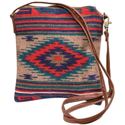 Red Hills Tribal Crossbody is a crossbody purse with an adjustable leather strap. This size of purse is perfect for everyday use, easily fitting a wallet, car keys, a phone, and a few other essentials. Purse features a red, blue, and brown tribal pattern that is reminiscent of Native American designs. The interior is lined with brown and cream striped cotton and has one slip pocket and one zippered pocket for organization. The top has a zippered closure for securing any valuables. Measures 9.75″ high by 9″ wide.