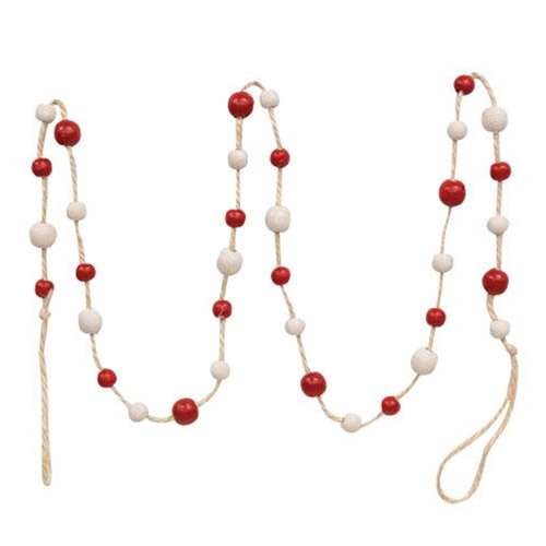 48″ Red & White Bright Bead Garland is a winter garland that features red and white wooden beads on a jute string. Garland has a loop at one end for hanging display and it looks great hung or draped over a shelf or mantel. Measures 48″ across.