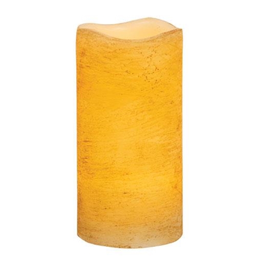 The Rustic Tan Timer Pillar is a simple, decorative pillar candle with a natural, wavy rim. The candle is a warm golden color and features a rough etched brown texture. This pillar is powered by 2-AA batteries (not included) and functions on a 6 hours on/18 hours off timer setting. This candle is a perfect year-round addition to everyday home décor, displayed alone or paired with a candle ring, and placed on a shelf, tabletop, riser, or other surface for a soft, cozy ambience. Measures 6” high and 3” in diameter.