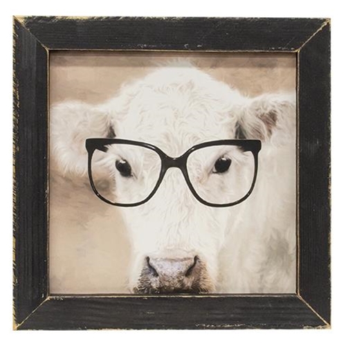 See Clearly Cow Framed Print features a close-up portrait of a fuzzy white cow with black rim glasses. Print has a painted frame with a distressed black finish that complements rustic and primitive furniture and decor and it has a keyhole slot installed at the back for wall display. Measures 13″ high by 13″ wide. Designed by Lori Deiter and made in the USA.