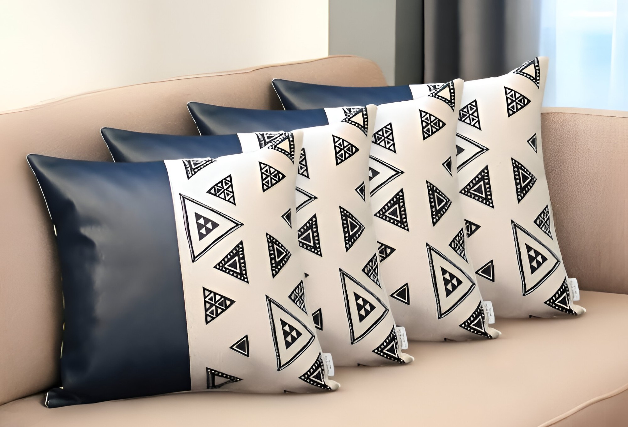 Set Of Four 18″ X 18″ Navy Blue Faux Leather Geometric Zippered Pillow