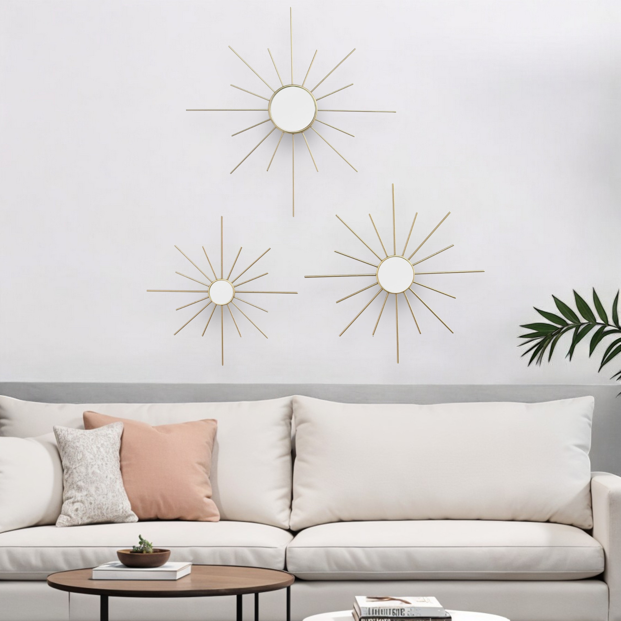 Set of Three Gold Mirrored Metal Sunburst Wall Decor
