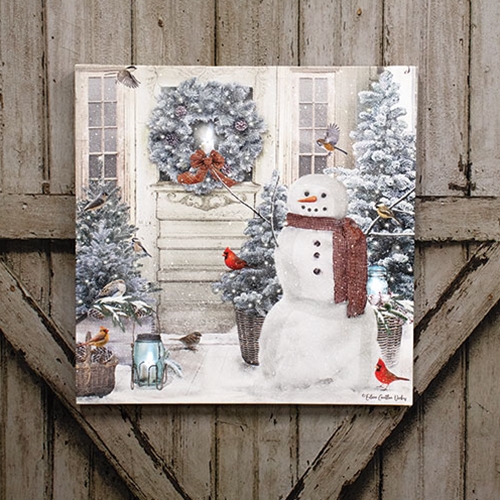 Snowman Porch Lighted Canvas is a canvas art piece fashioned with festive seasonal style. The canvas depicts a snowman set on a porch wearing a red houndstooth scarf and surrounded by falling snow. The porch also features evergreen trees, a wreath, a variety of baskets and lanterns, and birds. The canvas is accented by glittered details. Light accents are powered by 2 AA batteries (not included). A sawtooth hanger on the back allows for convenient hanging. Measures 18″ high by 18″ wide by 1″ deep.