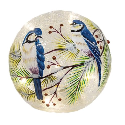 The Snowy Blue Jay Ball Ornament is a decorative tabletop orb made of clear glass with a frosted, crackled pattern. The orb is decorated with intricate hand-painted artwork of pine greenery and blue jay birds, featuring a raised texture with a glittered finish. The ornament houses a strand of LED lights for a cozy ambience, requiring 3-AA batteries for operation (not included). This ornament includes a silver top and a flat bottom, perfect for placing on a shelf or tabletop in the home during Winter and Christmas for a warm and wintry touch. Measures approximately 5.5” in diameter.