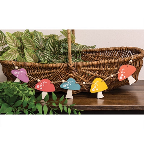 The Spring Floral Wooden Mushroom Garland is a darling decorative accent made with bright springtime style. The garland features 5 wooden mushroom cutouts strung along a jute cord. Each mushroom features white painted floral details, and they are each separated by a natural wooden bead. One mushroom is purple, one is pinky-red, one is teal, one is yellow, and one is coral. A hanging loop at each end allows for easy display. The garland is 28” long, the beads are .25″ in diameter, and each mushroom measures 3” high by 3” wide.
