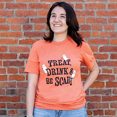 The Treat Drink & Be Scary Tee completes a spooky seasonal wardrobe with playful graphic design. The festive design features three white sheet ghosts dancing around black text that reads “treat, drink, and be scary.” One ghost carries a candy basket, one ghost holds a wine glass, and one ghost boasts an open-mouthed “boo” face. The soft cotton-blend tee features a heather orange hue and comes in 5 unisex sizes for a comfortable fit.