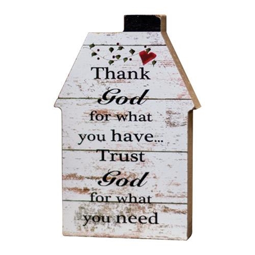 Trust God House reads “Thank God for what you have… Trust God for what you need” over a whitewashed, slatted-wood-texture background. A heart with a leaf-and-berry motif sits above the text. The block is freestanding and measures 4.75” high by 2.5” wide and .75” deep.