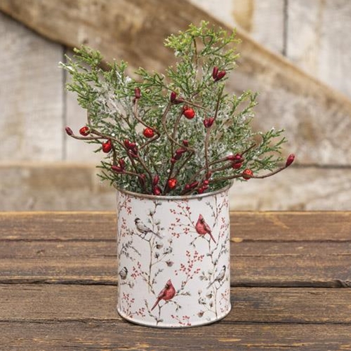 The Vintage Cardinal Metal Can is made of lightweight and durable metal and features bright red cardinals and pip berries against a white background. This can is ideal for displaying lovely florals over the winter season or throughout the year. Place vibrant red pip berries and green foliage inside to bring out the warmth of the white finish. Measures 4″ high by 3.25″ wide.