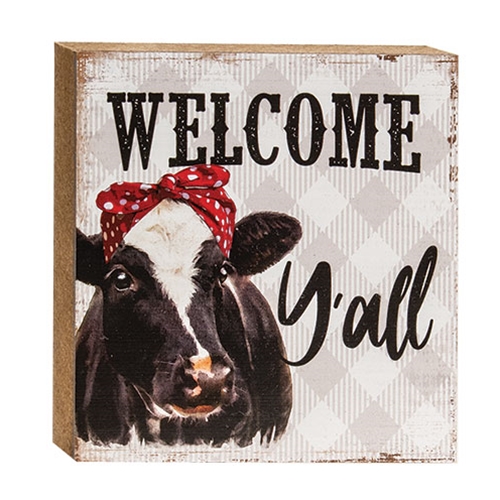 The Welcome Y’all Cow Block is a thick wooden block sign with natural wood edges and a distressed taupe checkered design. The block reads “Welcome Y’all” in stamped black lettering and features a black and white cow with a red polka-dot bandana. This block displays freestanding and brings a charming farmhouse touch to a shelf, table, or counter in the home year-round. Measures 6” by 6” and 1” deep. Made in the USA!