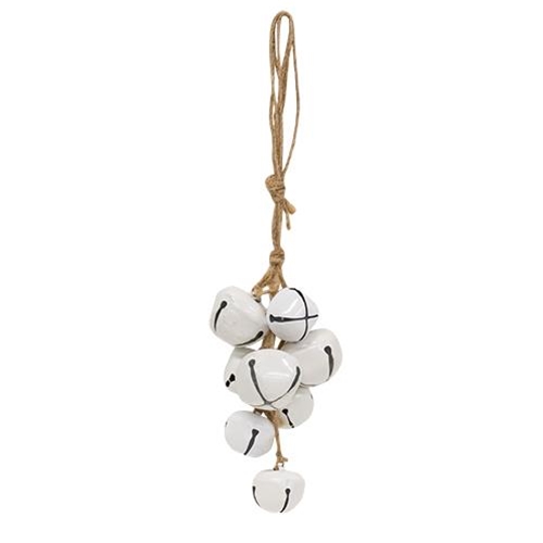 White Jingle Bells Cluster on Jute is a cluster of painted metal bells on a jute rope. Bells have a white finish that complements a variety of holiday decor and it looks great on hooks, nails, knobs, or floral branches. Measures 9″ high by 3″ wide, includes 7 individual bells.