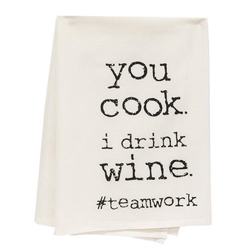 You Cook I Drink Wine Dish Towel is a white, 100% cotton dish towel that reads, “you cook I drink wine – #teamwork” in faded black lettering. It is machine-washable for easy upkeep and it looks great hung on a hook, towel bar, or the handle of an oven. Measures 28″ high by 28″ wide by .25″ deep.
